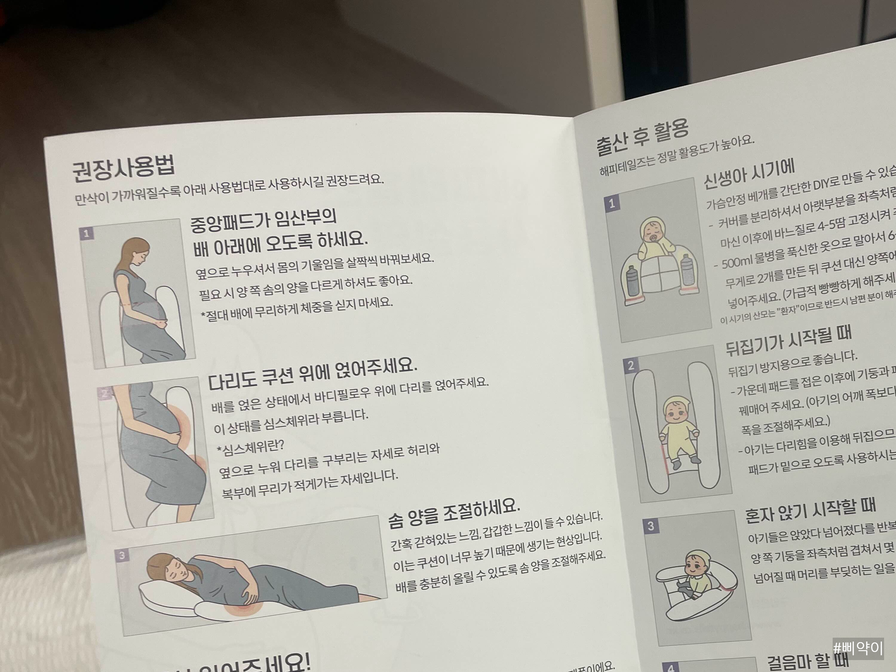 옆으로 누워서 베개를 다리사이에 끼우는 것처럼 사용하면 엄청 편해요. 그리고 출산하고 아기한테도 사용 할 수 있다니까 꾸준히 사용해보려구요:)